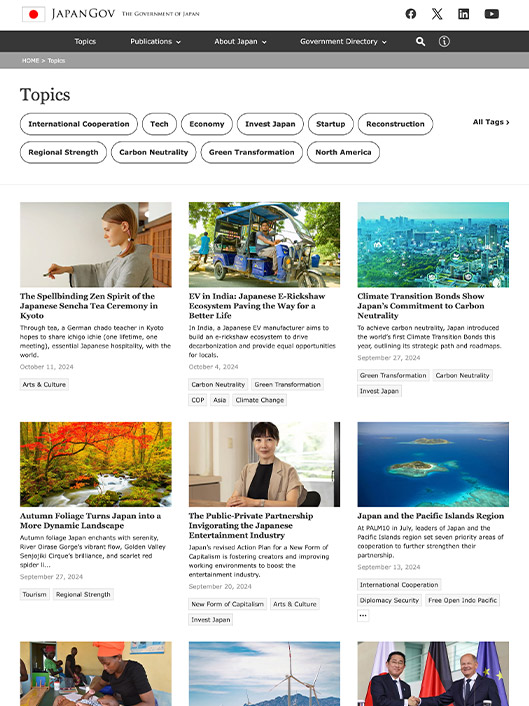 JapanGov features information about various topics, such as the creation of innovation and technology, and the appeal of Japan to overseas investors. Also featured are topics such as Japan's contribution to international development, women's empowerment, and regional revitalization in Japan.