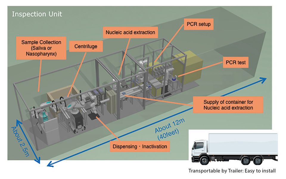 The robotic system also contributes to greater efficiency. In existing methods, tests are normally conducted in batches of 96 samples, but the new system is capable of handling eight-sample batches, one after the other. The time it takes from accepting a sample to reporting the result is reduced to 80 minutes, one-third the time it takes now. One system can perform 2,000 tests per day (16 hours), making it particularly suitable for venues where speed is important, such as international airports. The goal is to introduce the new system in 2021. It is also a space-saving unit that can be loaded into a 40-foot container and transported to large events, where it can be set up for testing.