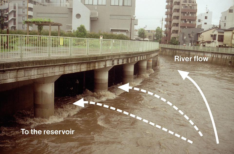 Tokyo, one of the world’s foremost metropolitan areas, is making use of underground spaces in the fight against flooding. One example is the underground regulating reservoir being constructed to prevent overflow from small and medium-sized rivers. When heavy rain causes a river’s water level to rise, water flows from a weir built into a revetment down into the reservoir, thus reducing the amount of water flowing downstream. So far, 28 such facilities have been constructed, collectively holding a total of 2.56 million m3 of water.