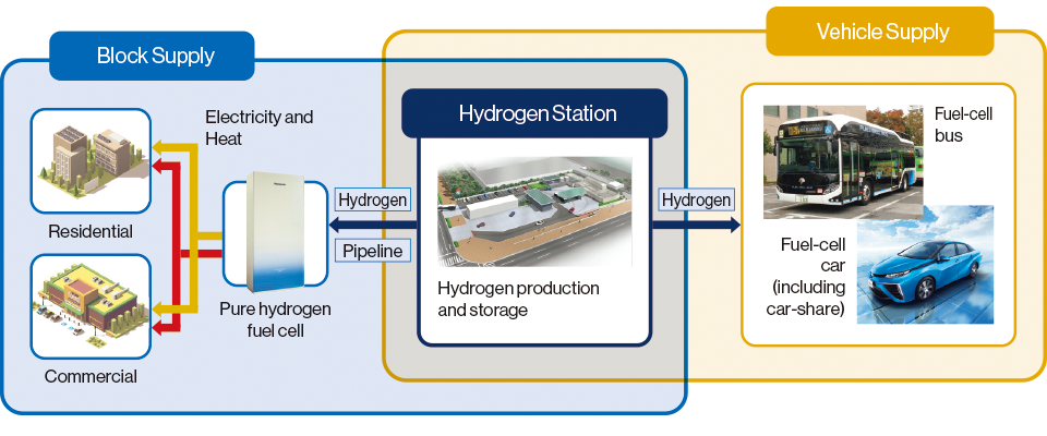 Utilization of hydrogen in the Olympic Village area. Not only is the hydrogen supplied from a hydrogen station used as bus and automobile fuel, but plans also include broadening the extent of practical applications for utilization in residential and commercial facilities.
