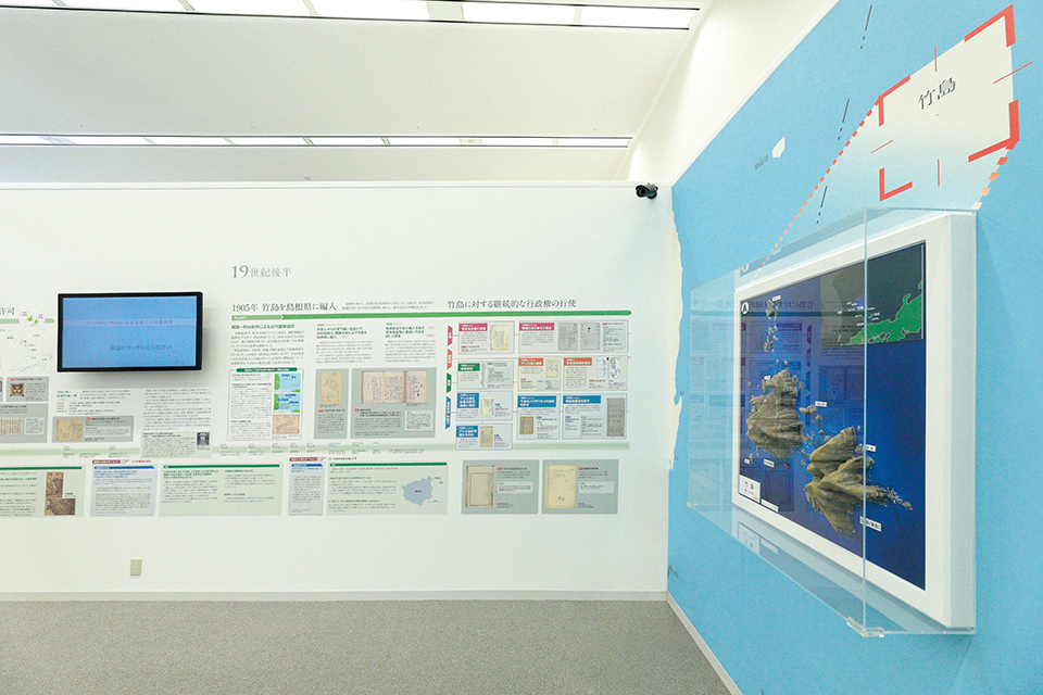 Display panels, a monitor showing video images, a diorama of the territory, and other exhibits comprise the Takeshima section. Evidence and documents substantiating the Japanese refutation are presented alongside the claims made by ROK.