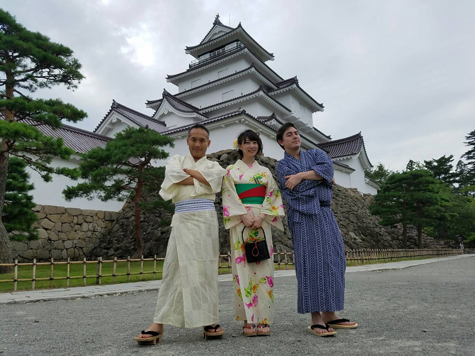 A guided tour of Tsurugajo Castle in Fukushima Prefecture, wearing yukata.