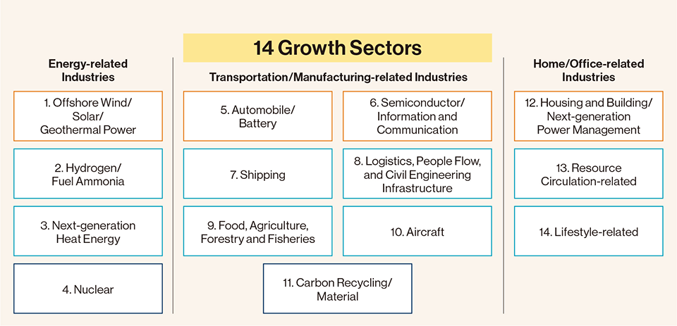 The Green Growth Strategy sets out 14 promising fields (see chart) in which future growth is expected, and where efforts are essential for achieving the reduction of greenhouse gas emissions. All available policy measures—from budget and taxation to regulatory reform—will be called upon to stimulate innovation in each of the different fields. Notable among these measures is the establishment of a 2-trillion-yen (18.2-billion-dollar) Green Innovation Fund, which will provide continuous support for a series of efforts from ambitious R&D to social implementation over the next 10 years. “We will provide continuous supports, but at the same time we can call on companies to aspire toward high-reaching goals for 2030 and a strong commitment to them. By introducing such supportive mechanisms, and using 2 trillion yen of governmental funds as pump priming, private companies are expected to increase their R&D and capital investment,” explains Kawahara.