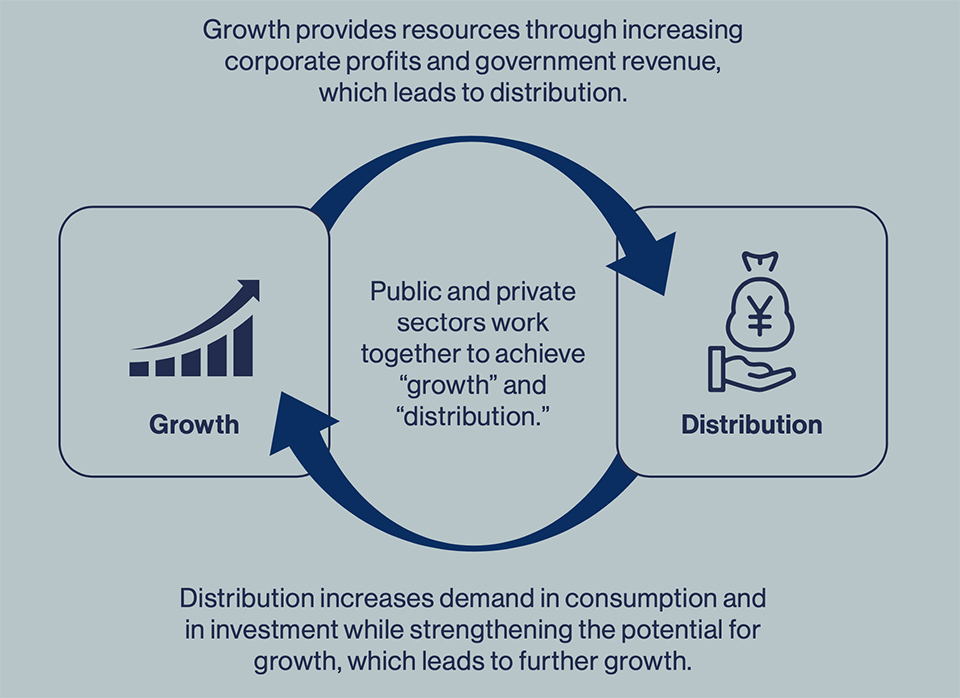 In this “New Form of Capitalism,” I will demonstrate to the people a clear and full picture of the historic challenges the Japanese economy and society are currently facing. Rather than leaving everything to the market and competition, we will focus on having both the public and private sectors work together towards reforms, sharing the full picture of social and economic transformation. Japan’s strong sense of solidarity becomes a foundation of a new public-private partnership.