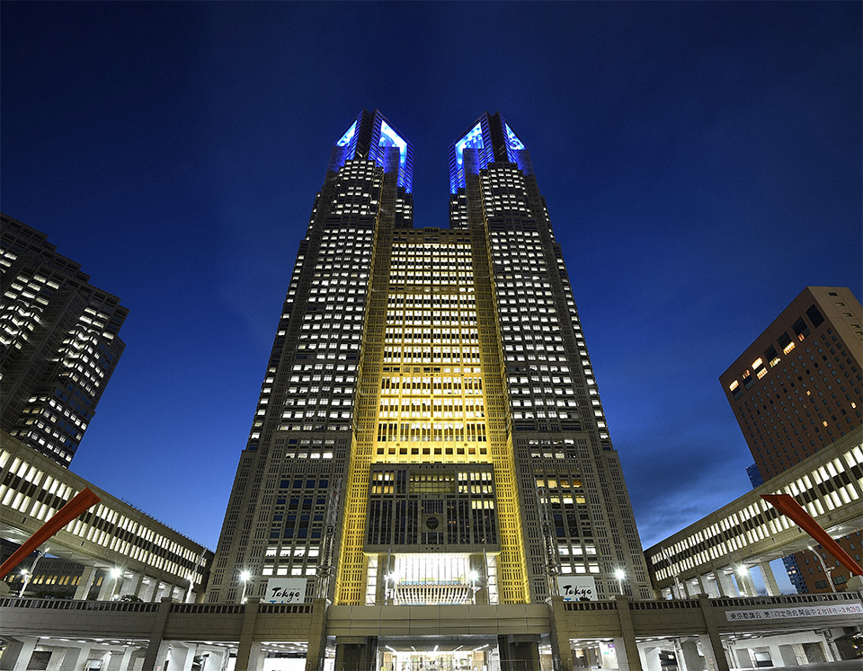 Blue and yellow, the colors of the Ukrainian national flag, lighting up buildings all over Japan. Tokyo Metropolitan Government Building (left) and Nijo Castle in Kyoto, a sister city of Mariupol, in Ukraine, show their solidarity with the country. MAINICHI / AFLO (LEFT), IMAGEMART (RIGHT)