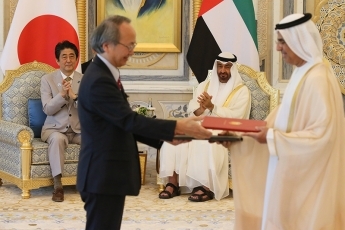 1. On April 30 (same day local time), H.E. Mr. Kanji Fujiki, Ambassador of Japan to the United Arab Emirates (UAE), and H.E. Mr. Obaid Humaid Al Tayer,Minister of State for Financial Affairs of the UAE, signed the “Agreement between Japan and the United Arab Emirates for the Promotion and Protection of Investment“ (the Japan-UAE Investment Agreement) and the exchange of signed text of the Agreement was witnessed by H.E. Mr. Shinzo Abe, Prime Minister of Japan and H.H. Sheikh Mohamed bin Zayed Al Nahyan, Crown Prince of Abu Dhabi and Deputy Supreme Commander of the UAE Armed Forces in Abu Dhabi, the UAE.