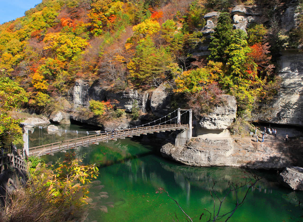 To no Hetsuri is a beautiful spot in Aizu, Fukushima Prefecture, that has been designated a natural national monument. The To no Hetsuri cliffs are 200 meters wide, carved by the forces of nature over the course of a million years. In autumn, the contrast between the white cliffs and the brightly colored leaves paints a breathtaking vista. In spring, lavender wisteria flowers adorn the towering cliffs.
