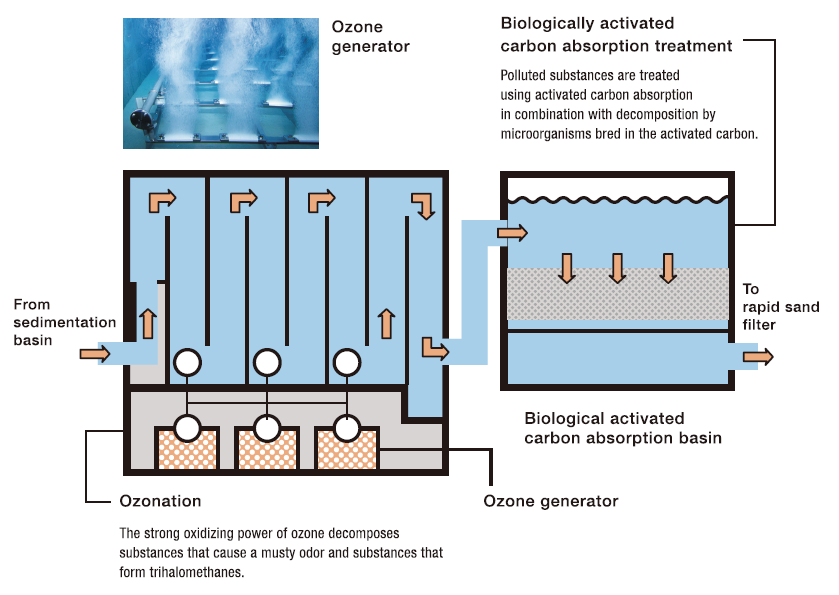 Tokyo also boasts quality water. Its sources are rivers that are not always clean, but a good water supply is ensured by an advanced purification system. In addition to conventional purification measures of sedimentation, filtering, and disinfection, Tokyo has added ozonation and biologically activated carbon absorption treatment. These complete a treatment system that provides safe, delicious water by eliminating the causes of bad smells and substances that result in harmful trihalomethane.
