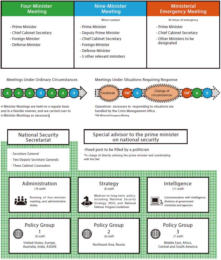 The core of the NSC is the “Four-Minister Meeting,” which consists of the prime minister, chief cabinet secretary, foreign minister, and defense minister. This group will convene expeditiously and hold regular meetings to formulate the basic orientation for national security, including medium- to long-term national security strategy. In the event of emergency situations involving the lives and property of Japanese people, the NSC will hold a Ministerial Emergency Meeting to discuss measures required for a prompt and appropriate response; such meetings will include additional ministers of state responsible for relevant matters. And when serious matters of national defense are at stake, civilian control will be ensured by the convening of a Nine-Minister Meeting, which will include the minister for internal affairs and communications, minister of land, infrastructure, transport, and tourism, and other ministers, to decide which actions to take.