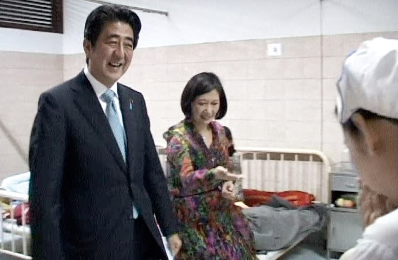National Maternal and Child Health Center (NMCHC) chief advisor Yuriko Egami escorting Prime Minister Abe around the center.