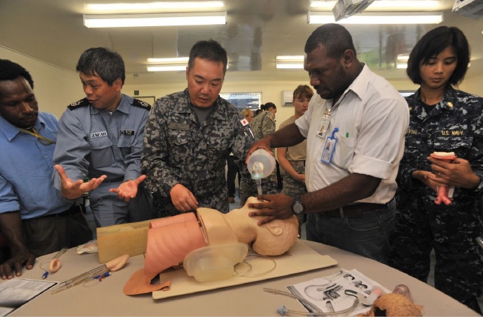The Pacific Partnership is the name given to activities hosted by U.S. forces started in 2007. The activities are aimed at strengthening mutual collaboration among participating nations and promoting smooth implementation of international disaster relief activities, while visiting countries in the Asia-Pacific region by ship, and providing medical care and exchanging cultures with local residents in cooperation with governments, militaries, international organizations, and civilian organizations such as NGOs. The MOD has been deploying medical personnel from the Maritime Self-Defense Force annually since 2007, and they have been participating in medical activities and engaging in cultural exchange with local residents.