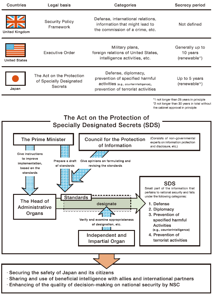 In many Western countries, laws on the protection of state secrets have long been in effect, while freedom of information acts are relatively recent. In Japan, in contrast, an information disclosure law (Act on Access to Information Held by Administrative Organs) has been in effect for some time, while up to now, the only legal provision on protection of national security secrets not related to defense has been the general duty of confidentiality imposed on civil servants under the National Public Service Act, with no general legislation for the protection of information concerning national security. Therefore, Japan has often been ridiculed as a paradise for spies. For this reason, some people said that it was not possible to obtain sufficient confidential information required for national security from Japan’s allies. The new law creates a framework to ensure the prevention of unauthorized disclosure of such information. Thus Japan has finally established a setup of the protection of secrets comparable to those of Western countries.