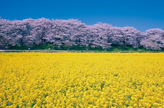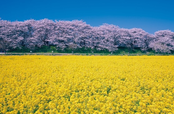 Approximately 1,000 Yoshino cherry trees, in a line extending for one kilometer, stand along the banks of the Gongendo river and hang over the road, forming a tunnel. Rapeseed flowers (na no hana) grow next to the embankment. The contrast between the pale pink of the cherry trees and the yellow of the rapeseed flowers overwhelms the viewer with its beauty! From March 26 to April 10 (a schedule depending on the state of the cherry blossoms), about 100 open-air stalls line the area, and many events are held.