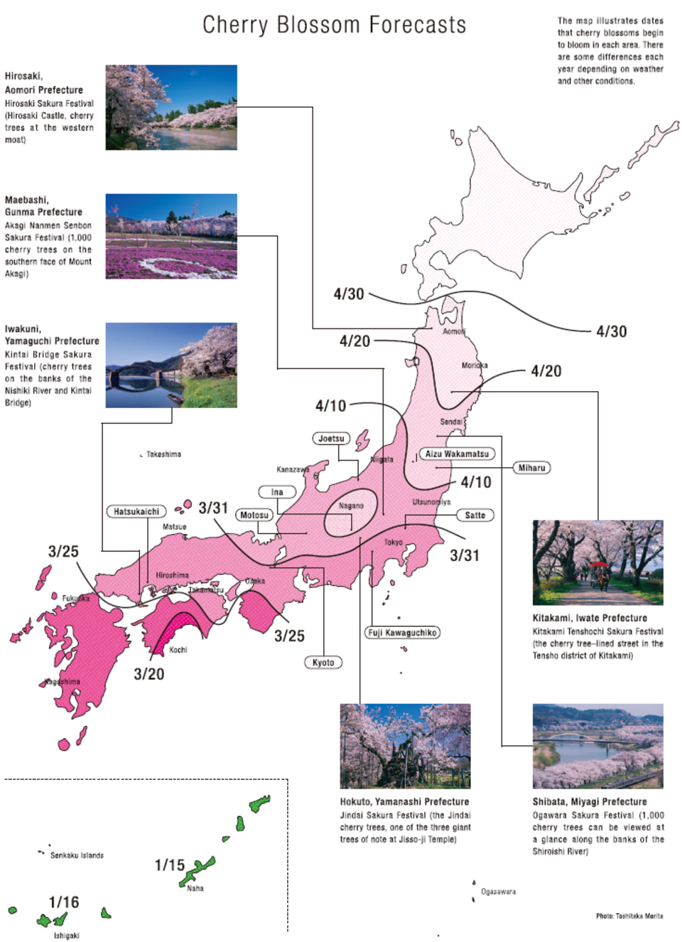 On the previous page we wrote, “When you make Japanese friends, ask them where their favorite spots are for viewing cherry blossoms.” Since you are our tomodachi (friends), we would like to tell you about some nice places that are famous for their cherry blossoms. Also, when you come to Japan in spring, please pay attention to the forecast released annually about the timing of cherry trees blooming. Reports are broadcast to inform people where and when the cherry blossoms will be at their best. You can ask people around you, or, if you inquire at your hotel, the staff there will surely tell you. We hope that you will have the opportunity to enjoy the wonderful cherry blossoms so beloved by the Japanese people, and that you will come to love them too!