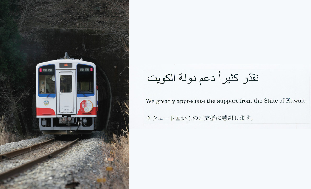 The new Sanriku Railway cars bought with relief funds from Kuwait carry the country’s national emblem on their front and back. The cars also carry inscriptions in Arabic, English, and Japanese expressing gratitude for Kuwait’s support.