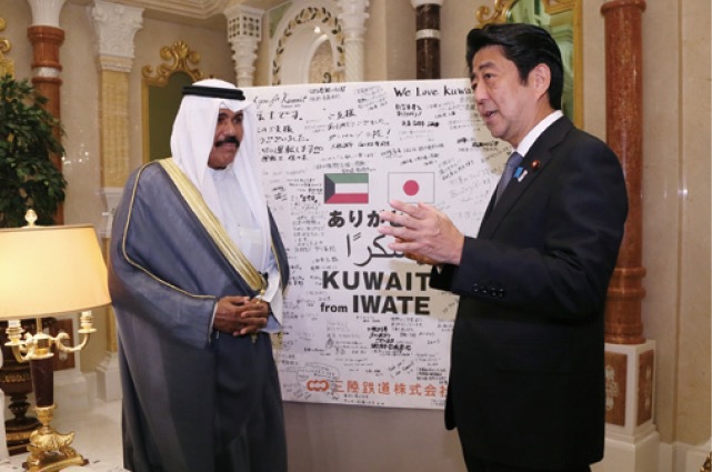 Visiting Kuwait in August 2013, Prime Minister Shinzo Abe meets with Crown Prince Sheik Nawaf and presents a poster inscribed with messages of gratitude from the employees of the Sanriku Railway and residents of communities along its route.