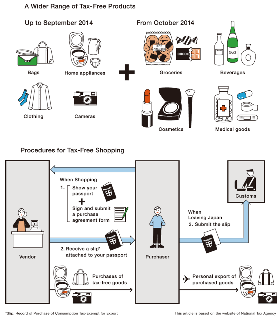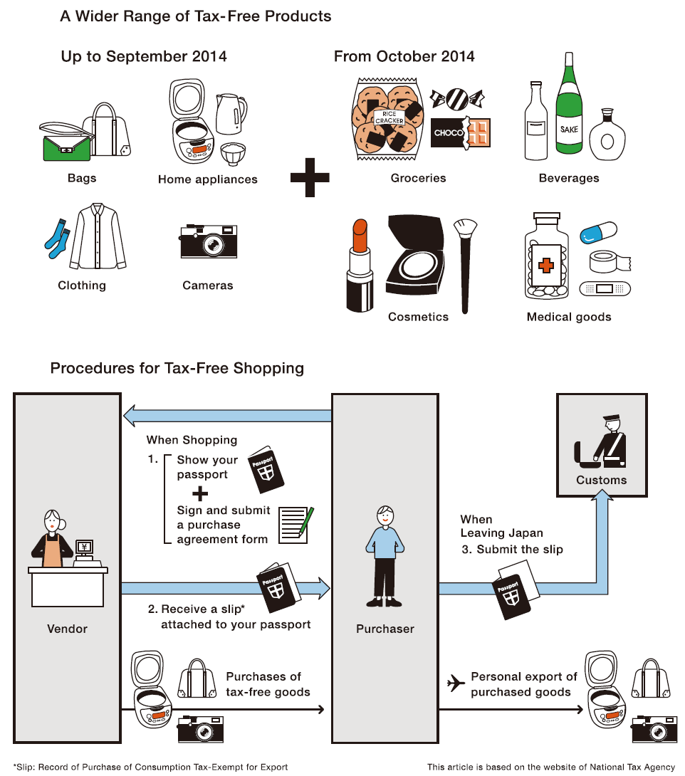 Here’s some more exciting shopping information to keep in mind: Beginning in Otober 2014, an even bigger variety of tax-free goods will be available for purchase. The range of tax-free items has been limited to home appliances, cameras, and clothing, but beginning in October 2014 visitors will enjoy tax-free shopping for products that are the pride of Japan, such as cosmetics, foods, medicine, and alcoholic beverages. This is a dramatic improvement for shoppers! Goods that are hard to find at airport stores, such as famous local sake, sweets, and other unique products, can be purchased taxfree. How exciting shopping will be!