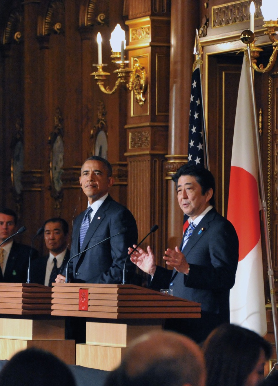 Attending a reception featuring Japanese cuisine with French President François Hollande during a visit to France, May 2014.