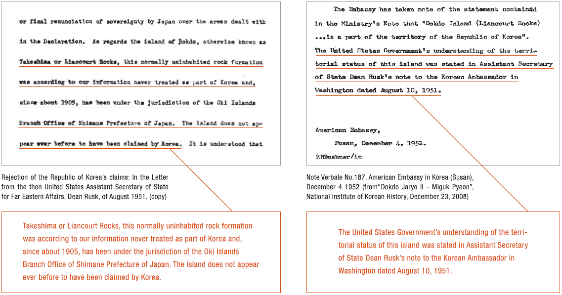 The San Francisco Peace Treaty, which is the very basis of Postwar Order in East Asia, did not include Takeshima in the territory to be renounced by Japan, confirming that it remains part of Japanese territory. This point is clearly confirmed in such public documents as the letter from then U.S. Assistant Secretary of State Dean Rusk to the ROK government, dated August 10 1951. At a time when the text of the treaty was being finalized, he explicitly stated that Takeshima had been under Japanese jurisdiction and that the territory was “never treated as part of Korea,” and that “[t]he island does not appear ever before to have been claimed byKorea.”