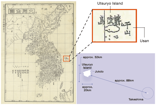 "Daehan Jeondo (Complete Map of Korea)" (1899), produced by the government of the Korean Empire, does not include Takeshima. This map shows that the island of "Usan" was located about 2 km away from Utsuryo Island. The ROK asserts that “Usan” is the old name of Takeshima, but it is apparently current Jukdo Island. Takeshima is about 88km far away from Utsuryo Island.
