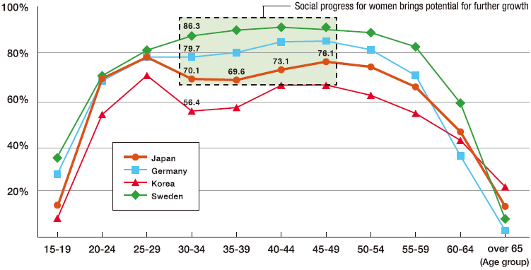 The Abe administration is working to expand female participation in the workforce. It aims to increase the employment rate for women age 25–44 from 68% in 2012 to 73% by 2020, and to increase the percentage of women in leadership positions to 30%.