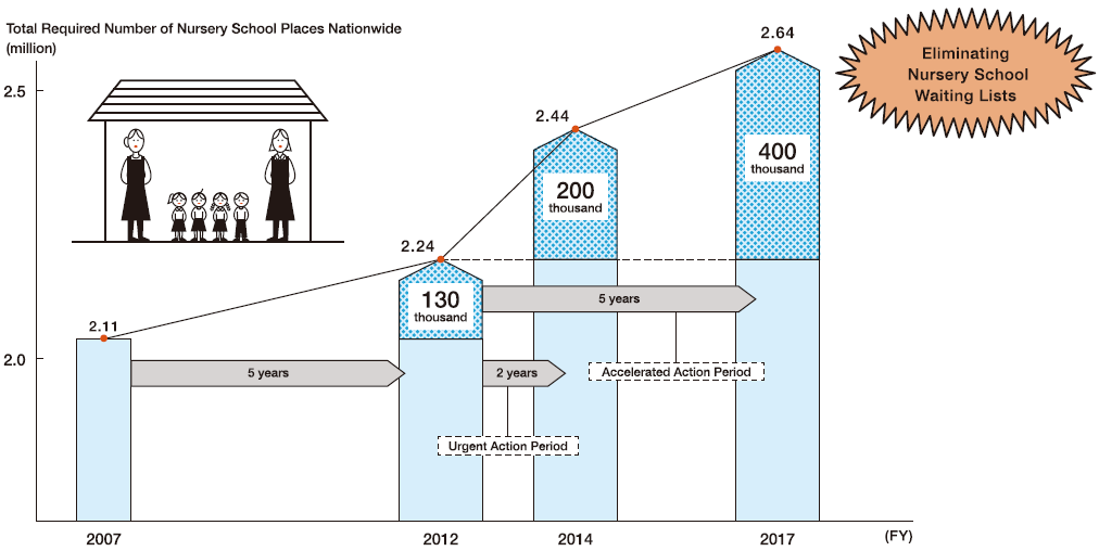 In Japan, 2017 is expected to see a peak in the number of children hoping to enter nursery schools. Plans are already underway to ensure that these needs can be met, thereby eliminating instances of children being placed on waiting lists due to a lack of available nursery school places. In the period from 2007 to 2012, the government provided 130,000 extranursery school places to address the shortfall in availability. Urgent action was taken in the two years to the end of fiscal 2014 to increase this figure to 200,000 places. The government aims to boost such action further to ensure that 400,000 additional nursery school places areavailable by the end of fiscal 2017.