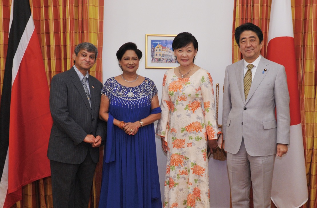 With Trinidad and Tobago’s Prime Minister, Kamla Persad-Bissessar, and her husband at a welcome dinner. This year marks the 50th anniversary of diplomatic relations between Japan and Trinidad and Tobago. (July 2014)