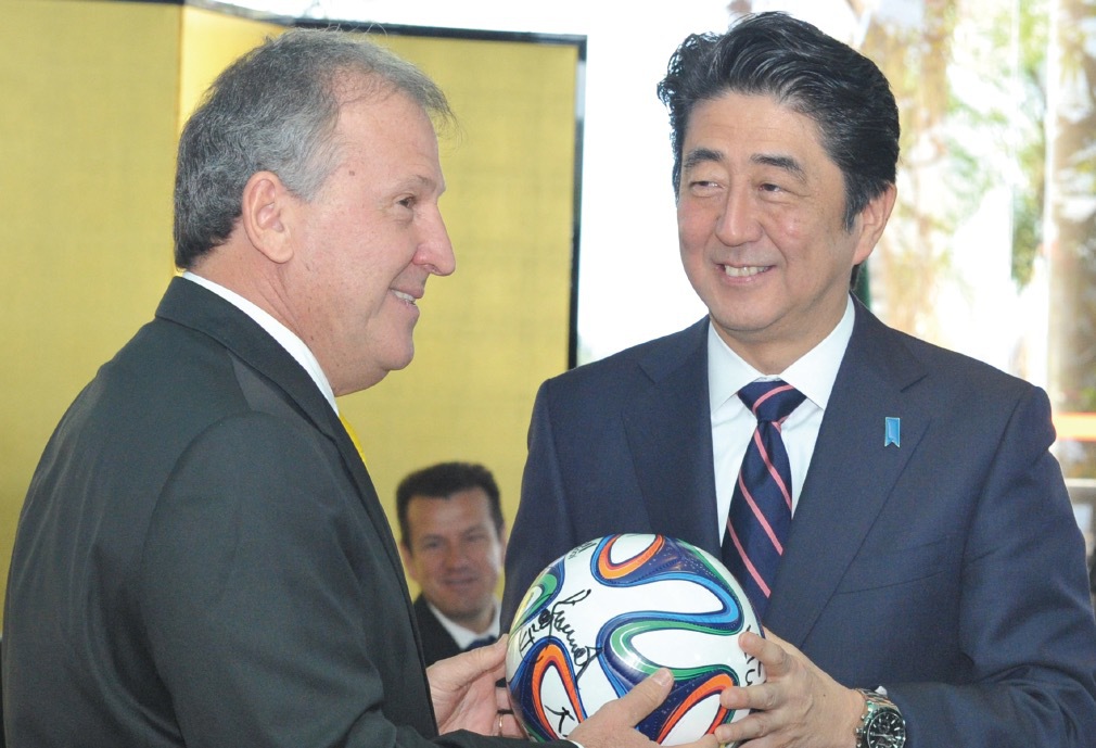 With Zico, the former manager of Japan’s national soccer team from 2002 to 2006. The Prime Minister expresses gratitude to Brazilian soccer players, who had done so much to advance soccer in Japan. (August 2014)