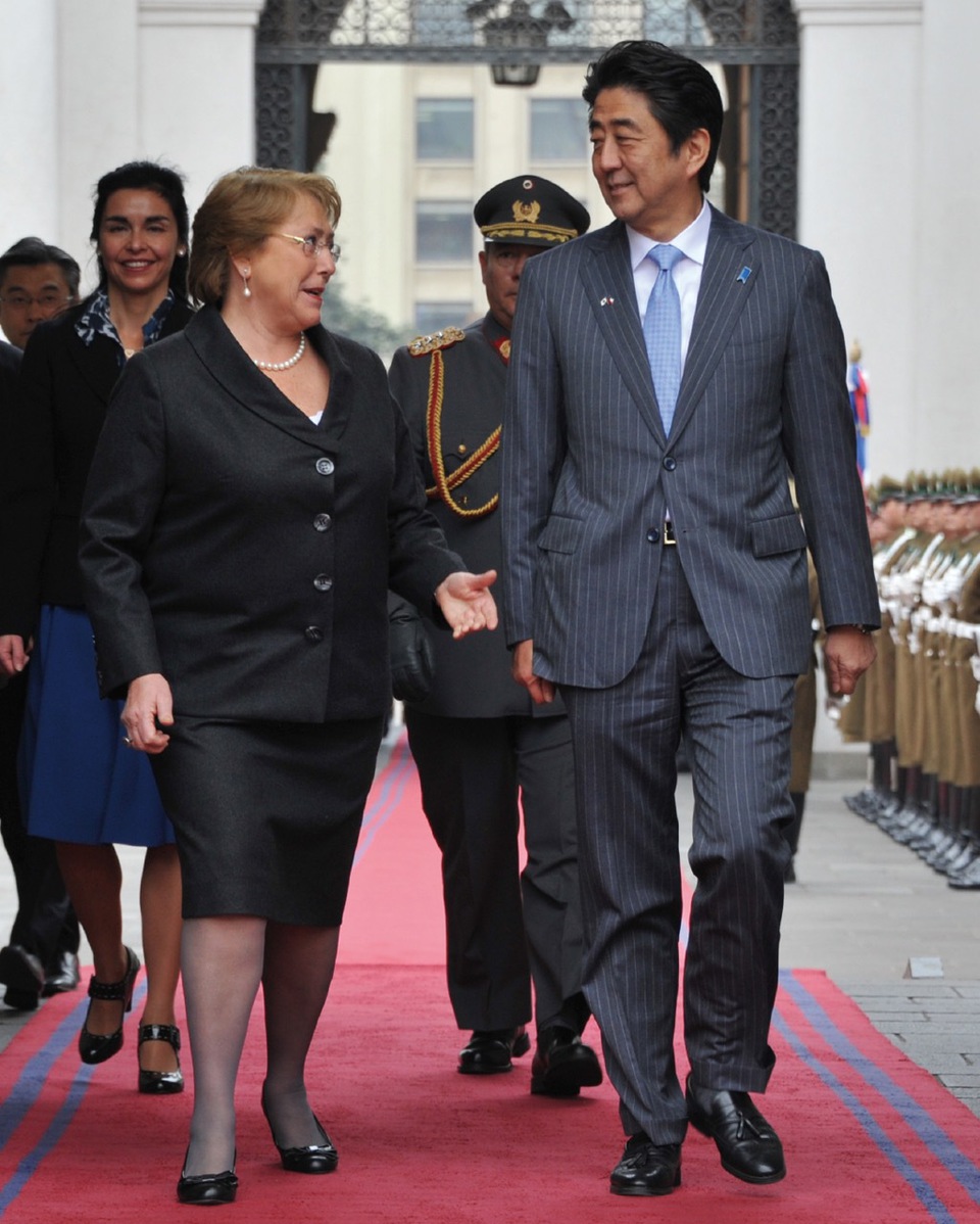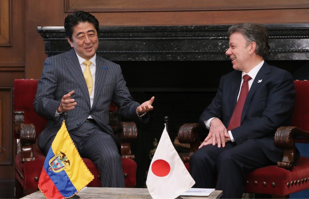 With Colombian President, Juan Manuel Santos, at their summit meeting. Abe’s visit was the first to Colombia by a Japanese prime minister. (July 2014)