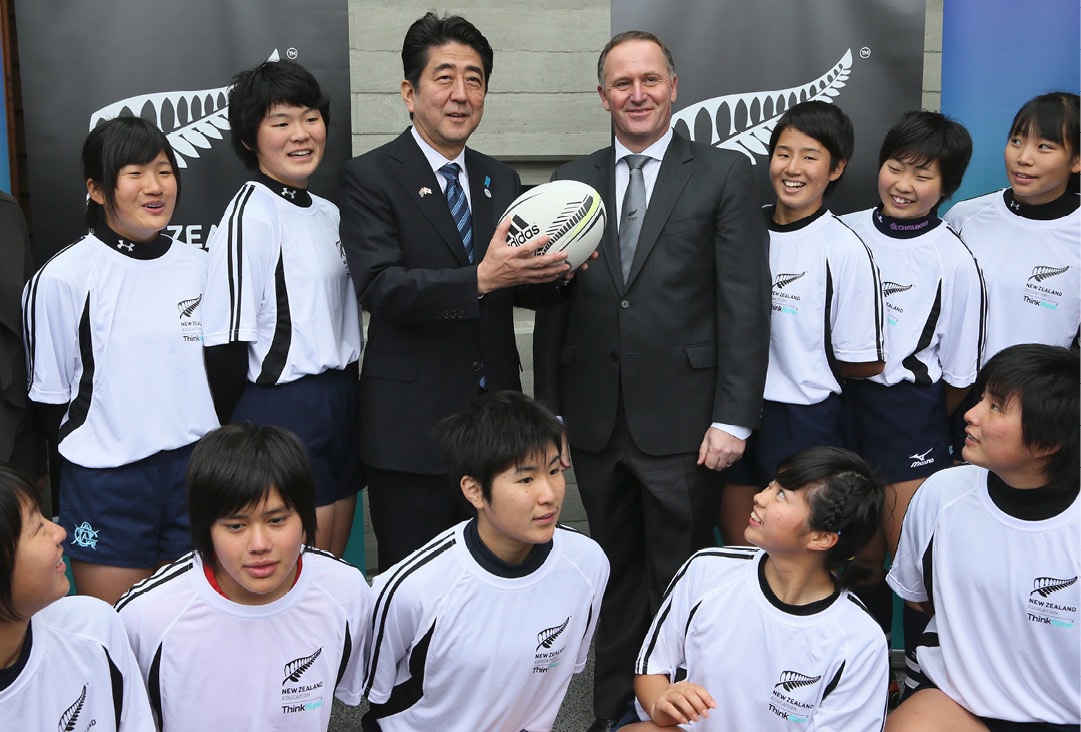With New Zealand’s Prime Minister, John Key, and rugby players. New Zealand, with its All Blacks, is well known as a rugby powerhouse. (July 2014)