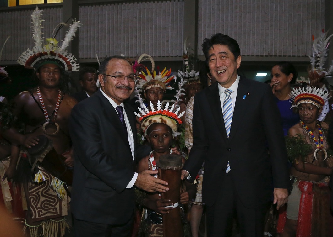 With Papua New Guinea’s Prime Minister, Peter O’Neil, at a gala event that he hosted. Prime Minister Abe was greeted by people in traditional costumes. (July 2014)