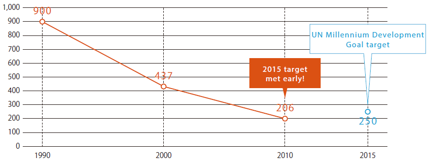 These efforts reduced maternal mortality rates from 900 per 100,000 births in 1990 to 437 in 2000 and still more to 206 in 2010. The target of reducing maternal deaths to 250 per 100,000 births by 2015, part of the United Nations Millennium Development Goals, was achieved five years ahead of time.