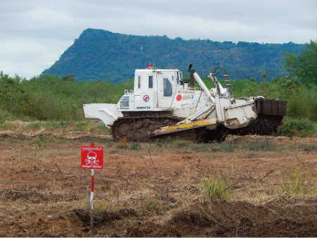 A mine clearing vehicle donated by a Japanese construction equipment manufacturer detonates antipersonnel mines.