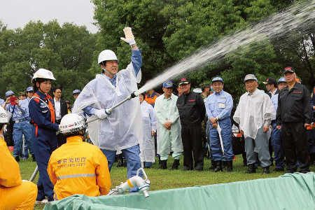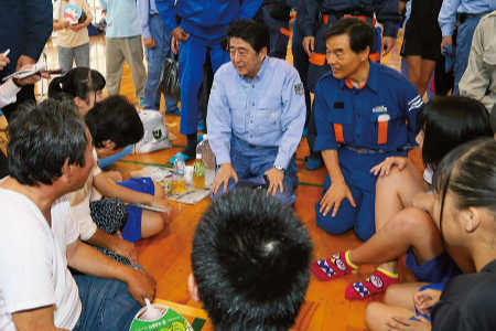 Visiting areas in the northern Kanto region damaged by typhoon-induced flooding and offering encouragement to evacuated residents (September 2015).