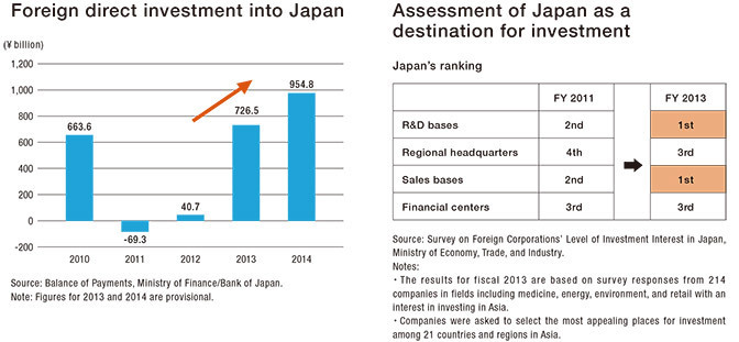 The Japanese yen has moved in the direction of depreciation and the international competitiveness of Japan as a business location has been increasing dramatically. In one series of surveys of Asian countries’ investment appeal for foreign corporations, Japan’s economic difficulties had led to its losing its once dominant position and being overtaken by other Asian countries. But the latest survey, taken in fiscal 2013, showed a recovery, with Japan winning the top spot in the rankings for R&D bases and sales bases. Japan’s reputation as a destination for investment has also improved significantly in terms of its innovation environment and its stock of infrastructure. As a result of these developments, the pace of foreign direct investment into Japan has grown more than tenfold since the start of the current Abe administration in December 2012.