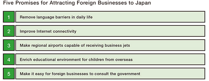 In March 2015 Prime Minister Abe took part in a meeting of the Council for Promotion of Foreign Direct Investment in Japan at which the body announced “Five Promises for Attracting Foreign Businesses to Japan” (as shown on the following page). The aim is to prepare and promptly implement steps to address causes of inconvenience and impediments commonly cited by foreign corporations and to create a “universal” business environment in Japan.