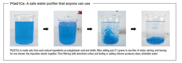 But this is not magic. The name of the water-purifying powder is PGα21Ca, and it is made from polyglutamic acid, the sticky component in the popular Japanese food natto (fermented soybeans). It was developed by Dr. Kanetoshi Oda, who heads the Osaka-based Poly-Glu Group.