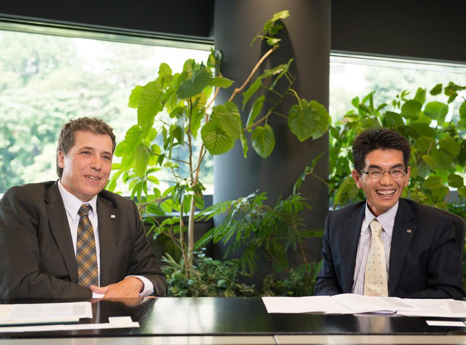 Ralf Annasentz (left), president of Merck’s Japanese operations, and Tsuguto Takeuchi, Onahama Site director.