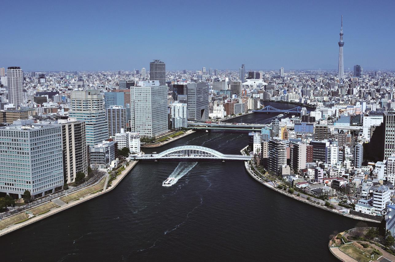 The Sumida River, though only 23.5 kilometers (about 15 miles) long, f lows through a densely populated area of central Tokyo, with about 3 million people living in its basin, and it is one of the capital’s most famous waterways. Until around the mid-twentieth century it was the habitat for fish and other aquatic life, and people gathered on its banks for recreation. But as the result of urban development during the rapid-growth years of the 1950s and 1960s, it became polluted and ceased to be an attraction.