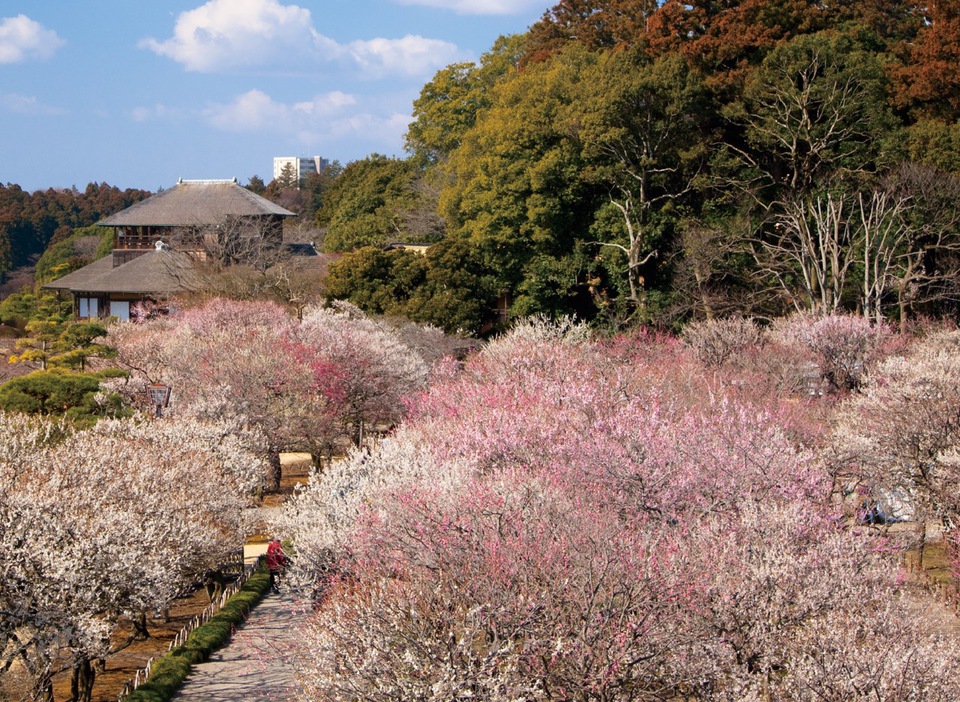 Kairakuen, which was completed in 1842, is located a seventyminute train ride from Tokyo and has long been famous for its plum blossoms. About 3,000 plum trees of 100 different varieties are planted in the 13-hectare garden. Many people visit every year to see the plum trees in bloom.