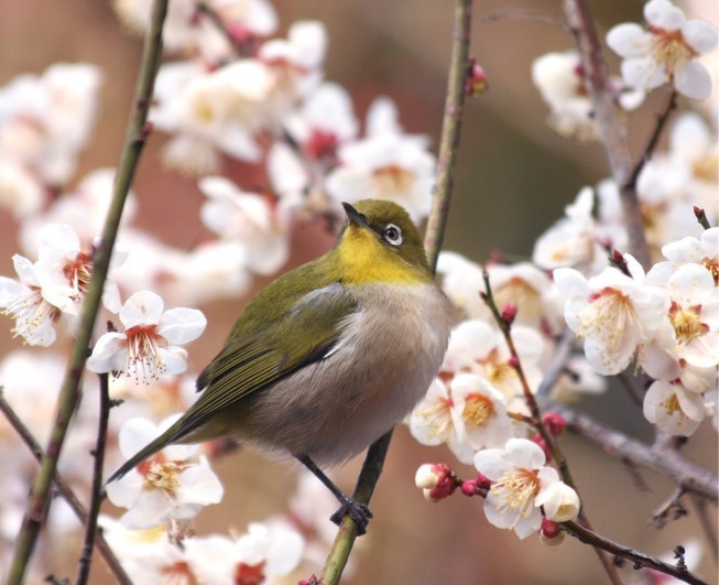A yellow-green Japanese white-eye (also known as mejiro) perched chirping among pink plum blossoms is a representative visual motif of the coming of spring.
