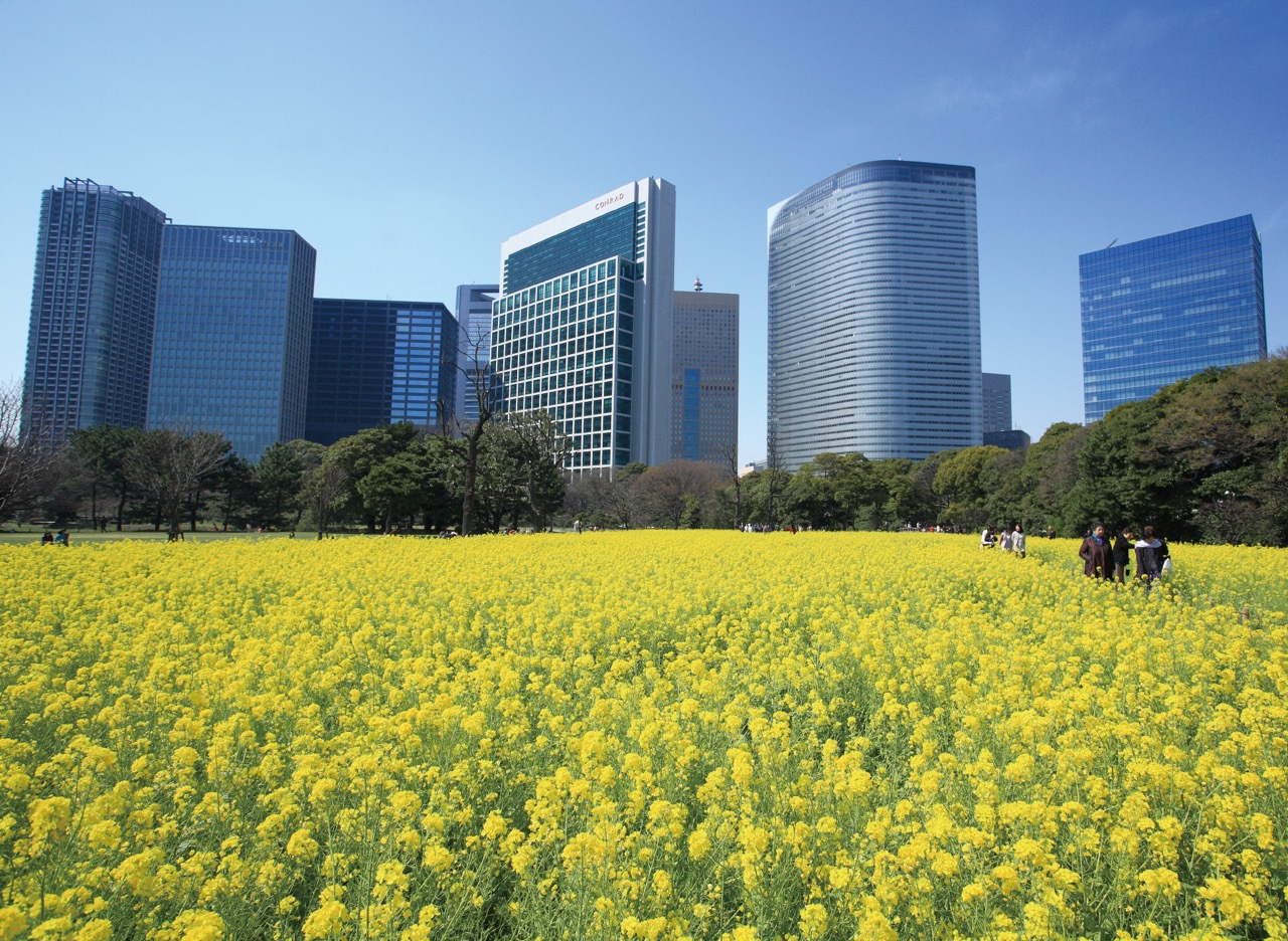 A field of rapeseed in bloom is like a yellow carpet spreading into the distance. At Hama-rikyu Gardens, in the heart of Tokyo, about 300,000 rapeseed plants bloom in spring. The contrast between the flowers in the foreground and the skyscrapers in the distance is the epitome of the Tokyo landscape.