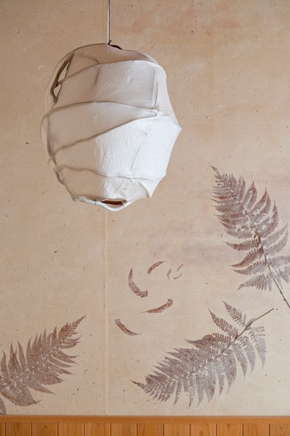 After visiting washi studios around Japan, he studied how to make paper in Ino, Kochi Prefecture, for eleven years. In 1992, he moved to Yusuhara in the same prefecture, where the water is clear, the climate cool, the traditional mountain village culture remains, and established his own studio. He follows a basic policy of growing his own paper mulberry trees and mitsumata bushes for raw materials and using no chemicals, such as preservatives and bleaching agents. “I believe good paper can be made only when there is a connection with nature,” Uitenboogaart says. This is why he insists on sticking firmly to traditional methods.
