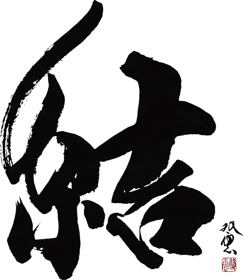 The character yui ( 結) is composed of two elements. The left half means “thread” while the right half means “to firmly tighten.” Together they express the idea of “tying threads together.”