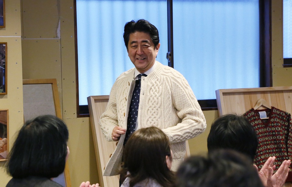 Prime Minister Abe visited Miyagi Prefecture to see firsthand the progress of reconstruction efforts following the Great East Japan Earthquake. During his visit he talked with knitters at a business making hand-knitted items and tried on one of their products (February 2015).