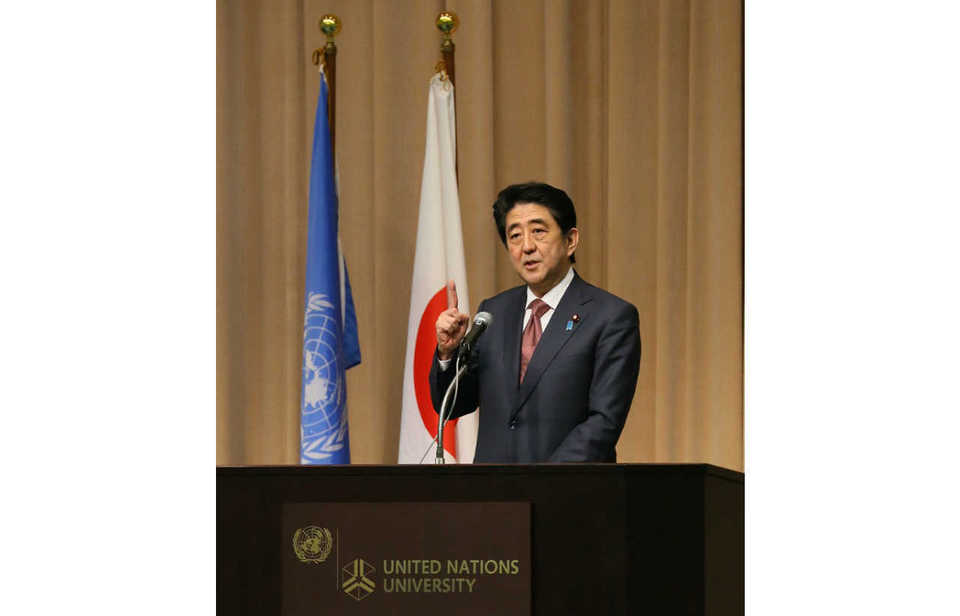 Giving a speech at a symposium to mark the 70th anniversary of the United Nations at the United Nations University (March 2015) .