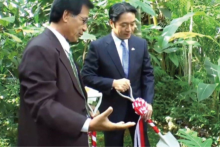 President Mori visited Kochi Prefecture, the birthplace of his great-grandfather, in November 2014. Located in the southern part of Shikoku facing the Pacific Ocean, Kochi boasts a rich natural landscape of lush forests and picturesque shores, and is blessed with the bounty of land and sea. The president visited the Kochi Prefectural Industrial Technology Center and watched attentively as liquor was made from local citrus fruits and bananas. Next he visited the Makino Botanical Garden, where he planted a breadfruit tree with Kochi Prefectural Governor Masanao Ozaki as a symbol of the friendship between Kochi and Micronesia. The breadfruit tree can grow up to 15 meters (about 50 feet) tall. The occasion has surely provided fertile ground for the friendship between Japan and Micronesia to grow just as big.