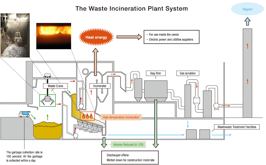 Household waste generated by approximately 9 million people (roughly 8,000 tons per day) is put out for disposal, collected within a day, and transported to waste incineration plants. The garbage collection rate is 100 percent. At the plant, the garbage is first mixed with a large crane so that all the different kinds and sizes of items are uniformly distributed for easier burning. Next, the waste is incinerated at extremely high temperatures, over 800°C (1,472°F). This reduces not only the volume to 1/20 of what it was but also the amount of dioxin gases produced by incineration. Multiple provisions are made to prevent gases and harmful substances emitted during incineration, such as sulfur oxide and particulate matter, from being emitted outside the facilities. Chimneys of waste incineration plants emit vapor—not smoke—that does not contain harmful substances. Heat energy produced by the incinerator is used to supply the electricity needs of the entire facility, with any remainder being sold (earning approximately JPY 9.8 billion annually, or USD78.6 million, in income from electricity). High-temperature water is also supplied to neighborhood swimming pools and tropical plant greenhouses.