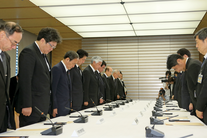 Prime Minister Abe attended a meeting of the Ministerial Council on the Terrorist Incident in Bangladesh at the Prime Minister’s Office and offered a silent prayer for the victims, including the seven Japanese who lost their lives in the incident (July 2016).
