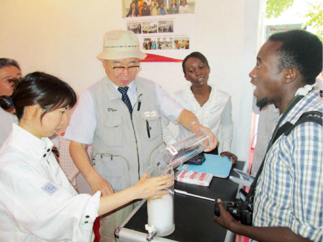 The turning point came in 2004, when the water purifier was used to provide drinking water for victims of the Indian Ocean earthquake and tsunami. This successful application attracted global attention to the product, which was subsequently supplied for use in such places as Thailand, Mexico, and Bangladesh. And as it built up a good reputation through practical application, there were increasing inquiries from developing countries. It is currently being used to purify water from ponds and marshes in over 40 countries struggling with shortages of drinking water.